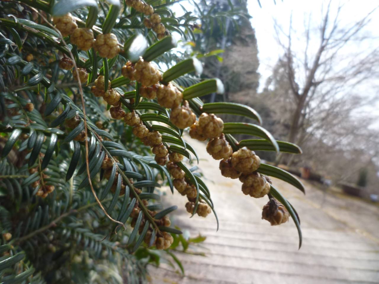 イヌガヤの薄茶色の花、園庭ではスズメノヤリの茶色の槍のような花が満開でした。