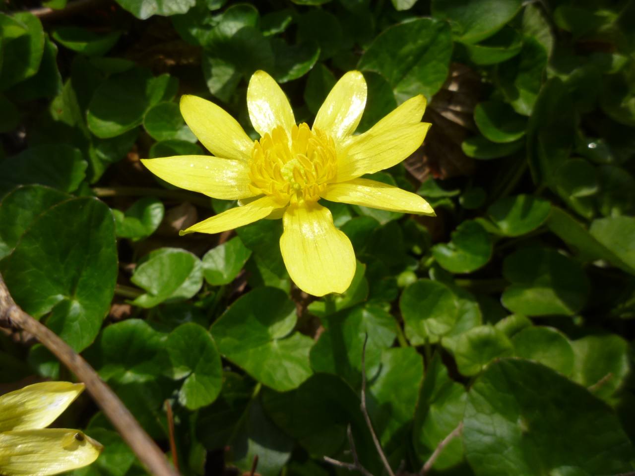 スミレはまだ早いのか一ヶ所でタチツボスミレが可憐に咲いていた。それに比べて外来種のヒメリュウキンカの黄色い花が目を引きます。