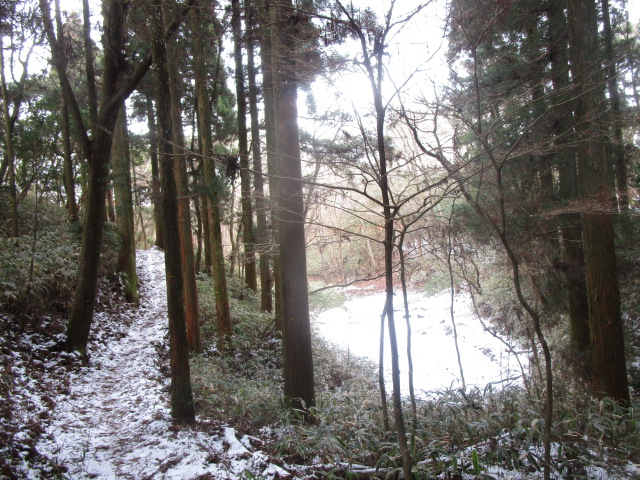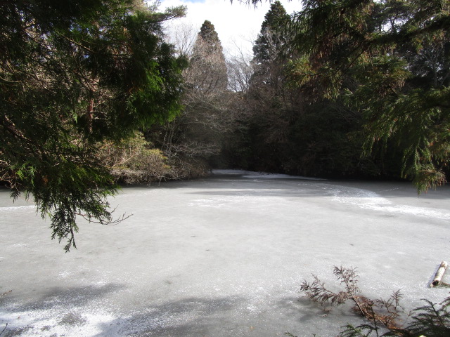 ブォーリス山荘方面への道も針葉樹の森の中なので積雪状態です。瓢箪池は全面凍結しています。