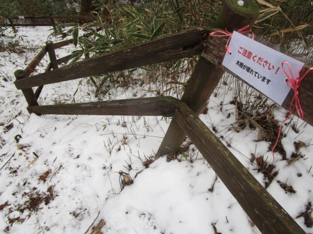 急こう配の階段がありますが、下りは積雪で滑りそうです。右側に手すりの柵が設置されているのですが、老朽化していて頼るのは危険です。「ご注意ください・木柵が壊れています」という看板が掛かっています。
