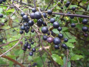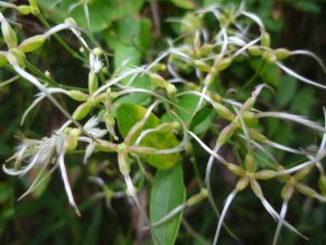 今食べごろ?のサンカクヅルには黒っぽい果実がびっしりついていました。センニンソウの花が終わり柱頭が伸びて白い毛が出てきました。