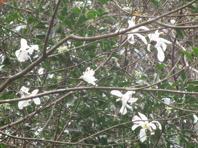 さっそく樹木を見上げると白い花が咲き誇っています。オオカメノキとタムシバです。