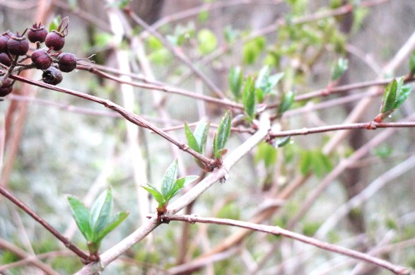 それでも樹木をよく見ると新芽が吹き出して若葉が開いてきています。「山笑う」状態になるのはもうすぐでしょう。