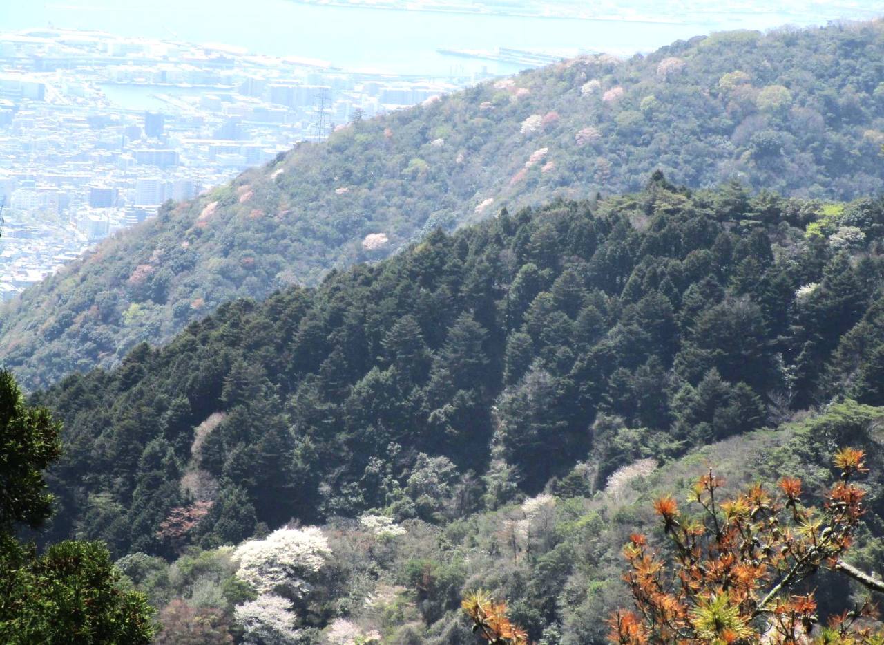 最後は摩耶山方面の眺望です。山肌は桜などの花が点在して華やかですね。やはり「山笑う」春が体感できます。