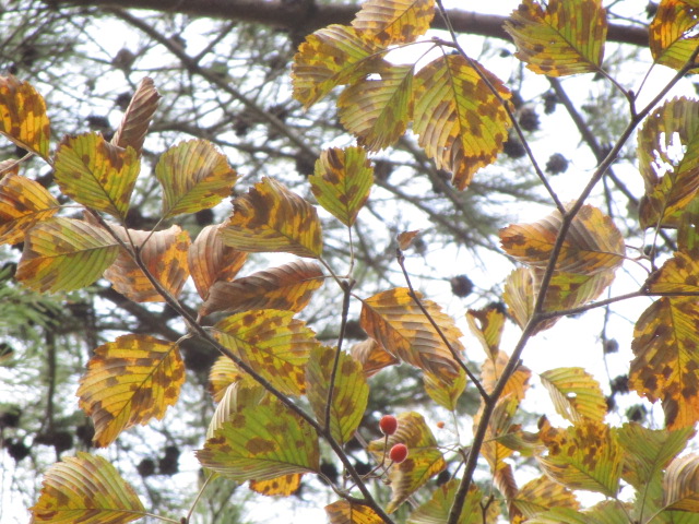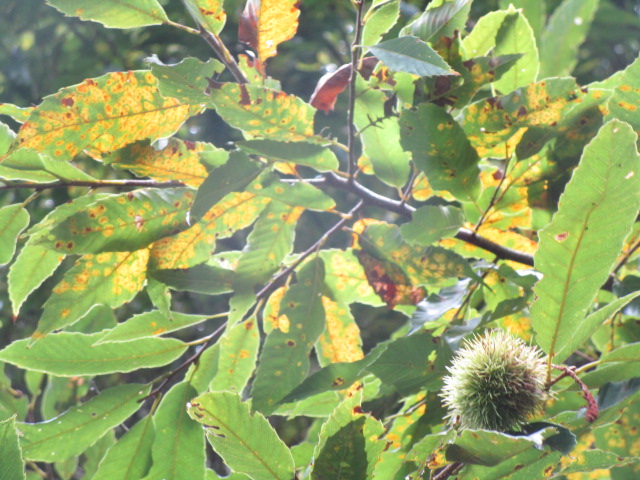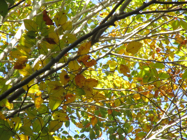 クリの葉は色づき始めたばかりです。黄色く色づいた葉にまだら模様が目立つのはウラジロノキです。