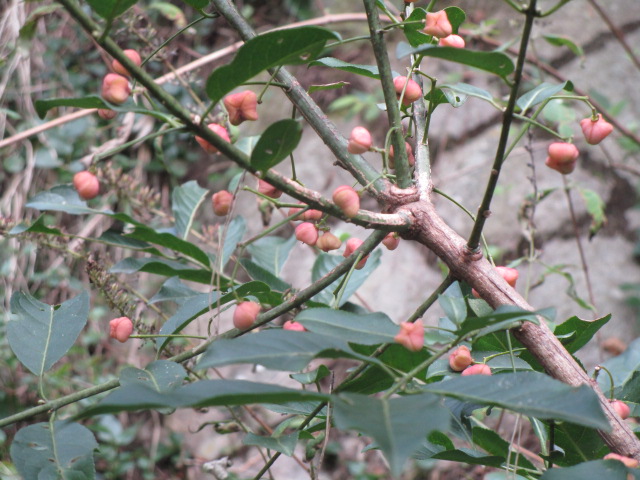 ニシキギの仲間は赤い紅葉が鮮やかですが、マユミの葉は緑色で色づいていません。緑の葉に赤い模様ができているのはツリバナです。
