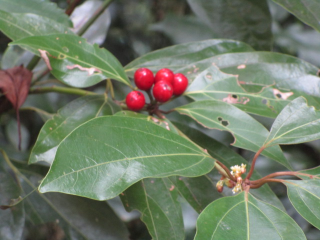 シロダモは昨年の花の実が赤く熟していますが、同時に今年の花を咲かせています。
