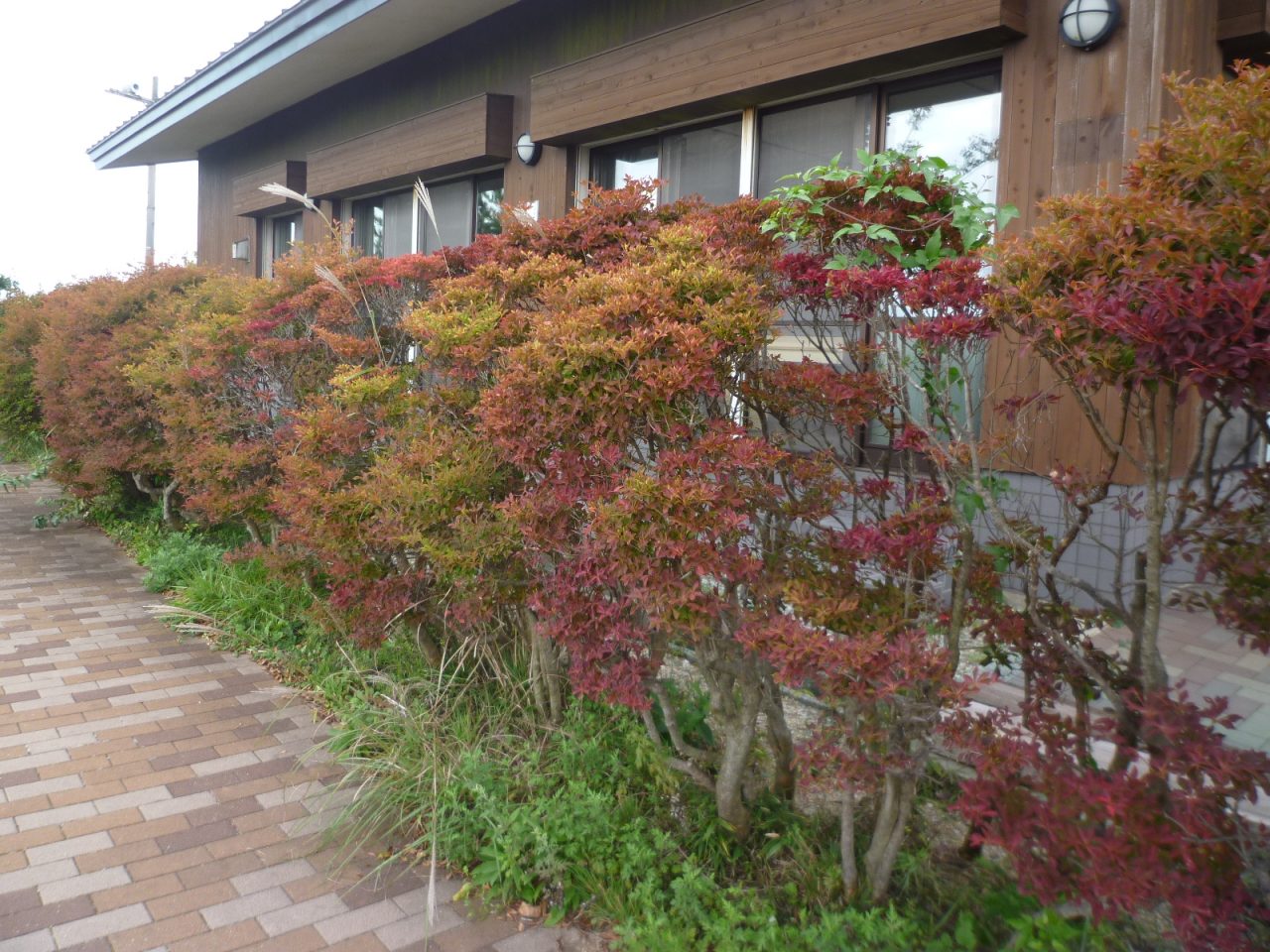ビジターセンターの園庭では、紅葉したドウダンツツジ・カシワバアジサイ、風に吹かれてなびいているススキ、赤いサネカズラの実など見どころ満載ですよ。紅葉はまだまだですが、来てくださいね。